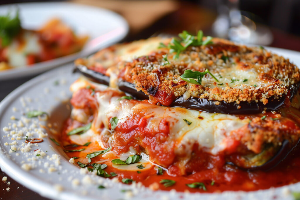 • Parmigiana di melanzane: Ein herzhafter, duftender Klassiker – geschichtete Auberginen mit Tomaten, Basilikum und goldener Kruste aus dem Ofen.